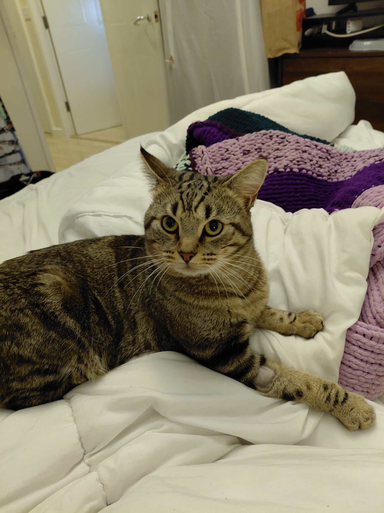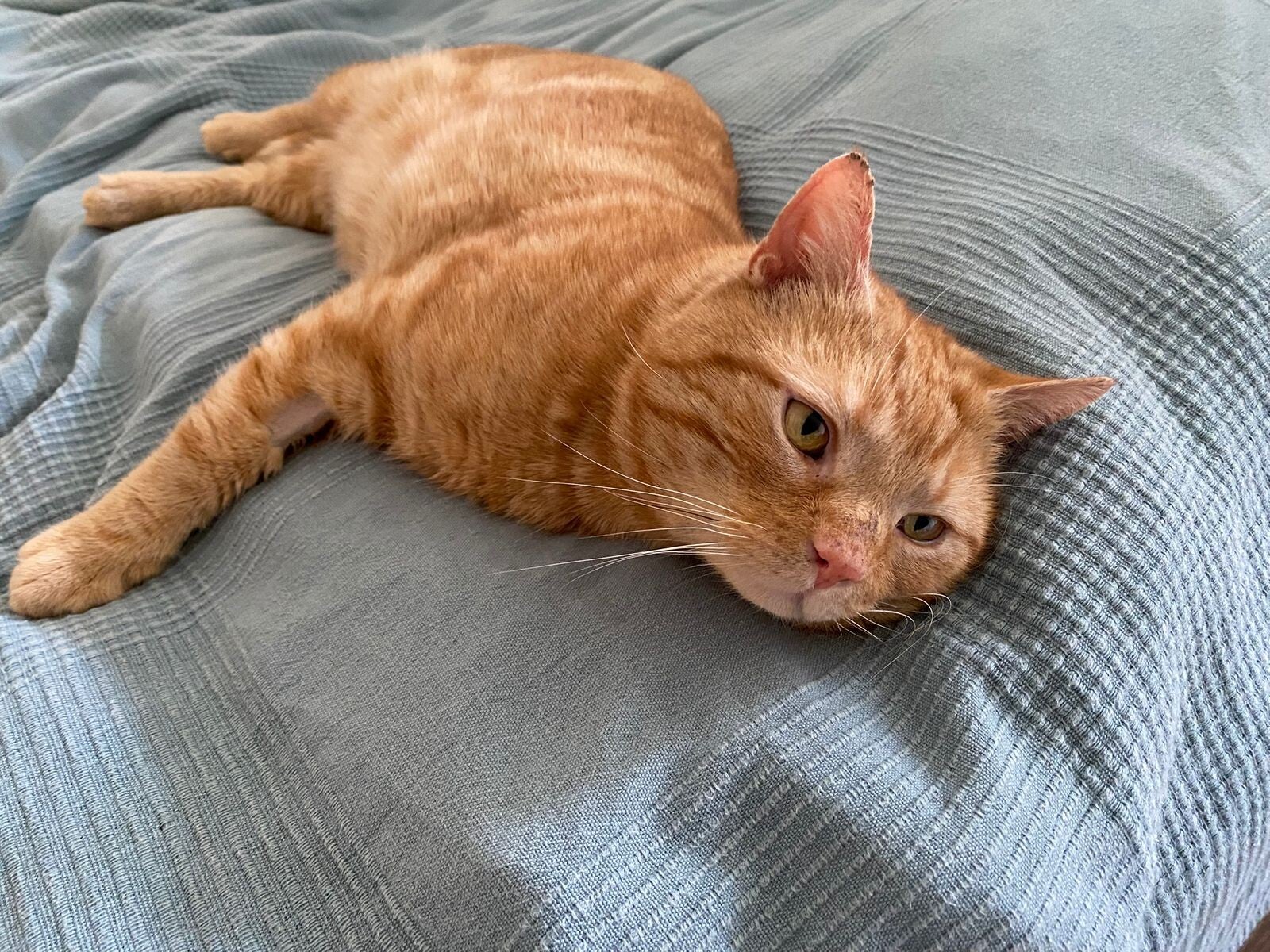 Garfield is a very brave little tripod. Unfortunately due to an injury his left leg had to be amputated due to nerve damage however that hasnt stopped him at all and his recovery has been successful. Garfield adores attention just as much as he does food hence being a big boi! Although he only has 3 legs garfield can still run, jump and play just as well as any other cat and doesnt let it slow him down. He is neutered, chipped and vaccinated.